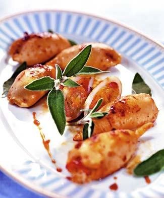 Этой смесью нафаршировать очищенную тушку кальмара, поместив в центре лосося. Подогреть.